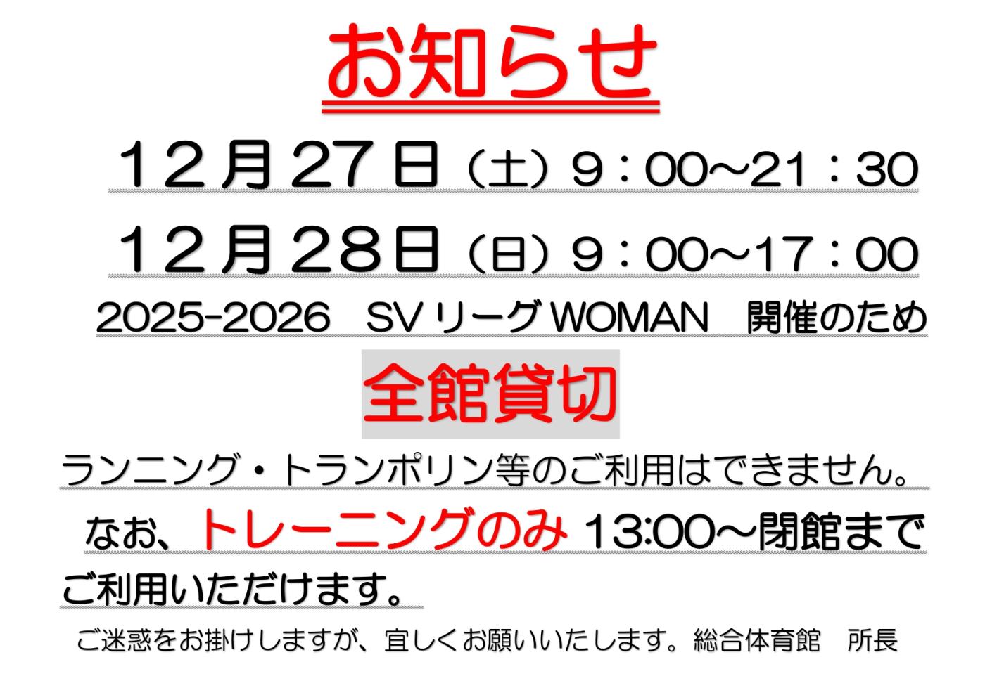 HOMEお知らせ一覧【お知らせ】12/27(土)〜28(日)の体育館の施設利用について