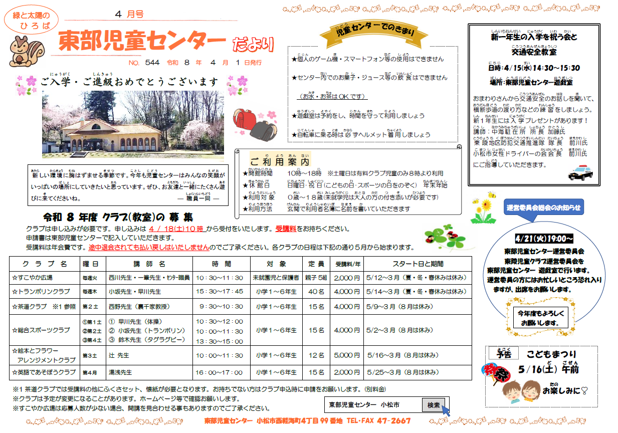 お知らせ HOMEお知らせ一覧東武児童センターだより4月号 2026.03.23福祉・学童new【東部児童センター】東武児童センターだより4月号 新しい環境に胸はずませる季節です。 今年も東部児童センターはみんなの笑顔がいっぱいの場所にしていきたいと思っています。 ぜひ、お友達と一緒にたくさん遊びに来てくださいね! 一覧 次へ