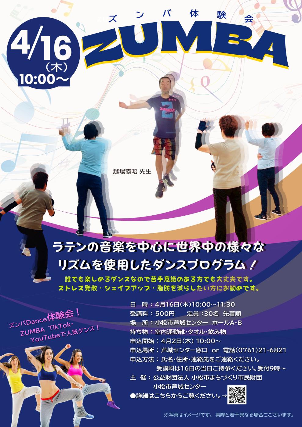 お知らせ HOMEお知らせ一覧『ZUMBA(ズンバ)ダンス』体験会 2026.02.05文化・観光【小松市芦城センター】『ZUMBA(ズンバ)ダンス』体験会 ・ZUMBA(ズンバ)幅広い年代が楽しめる人気ダンスの体験会(新規スタート向け) ラテンの音楽を中心に世界中の様々なリズムを使用したダンスプログラムでYouTubeでも大人気! だれでも楽しめるダンスなので苦手意識のある方でも大丈夫です。 ストレス発散・シェイプアップ・脂肪を減らしたい方におすすめです。 講師 : 越場 義昭 氏 (スポーツクラブでZUMBA教室の人気講師) 添付ファイル 前へ 一覧 次へ