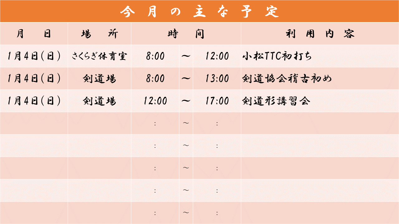 お知らせ HOMEお知らせ一覧小松市武道館 1月の行事予定(変更1) 2026.01.08スポーツnew【小松市武道館】小松市武道館 1月の行事予定(変更1) 小松市武道館1月の行事予定(変更1) 前へ 一覧 次へ