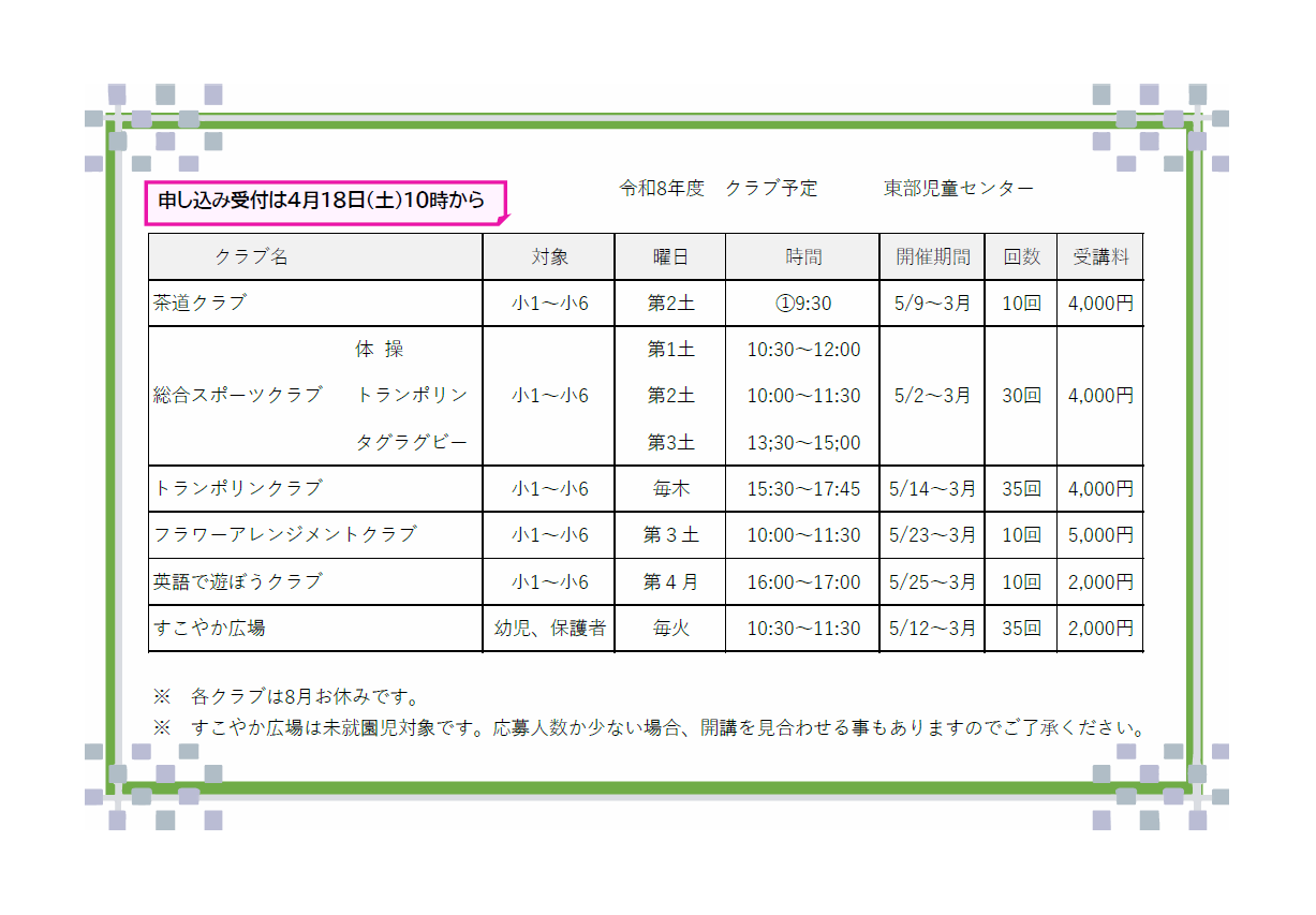 お知らせ HOMEお知らせ一覧令和8年度 東部児童センター クラブ予定表 2026.01.10福祉・学童new【東部児童センター】令和8年度 東部児童センター クラブ予定表 令和8年度 東部児童センタークラブの予定紹介です 申込みは4月18日(土)10時より受付します 各クラブとも定員になり次第申込みを締め切ります 会費を添えて申込用紙を記入の上申し込みください(申込用紙は当日センターにて記入していただきます) 会費はいかなる場合においても返金はできませんのでご了承ください ※ これは令和8年1月現在のもので4月申込み時には日程等変更になる場合があります 添付ファイル 前へ 一覧 次へ
