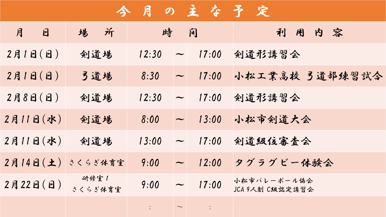 お知らせ HOMEお知らせ一覧小松市武道館 2月の行事予定(変更1) 2026.01.14スポーツnew【小松市武道館】小松市武道館 2月の行事予定(変更1) 小松市武道館2月の行事予定(変更1) 一覧 次へ