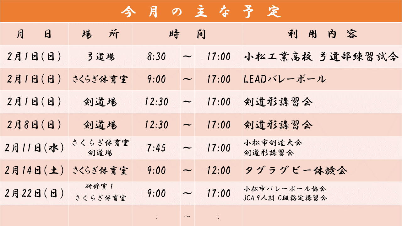 お知らせ HOMEお知らせ一覧小松市武道館 2月の行事予定(変更1) 2026.01.25スポーツnew【小松市武道館】小松市武道館 2月の行事予定(変更1) 小松市武道館2月の行事予定(変更1) 前へ 一覧 次へ
