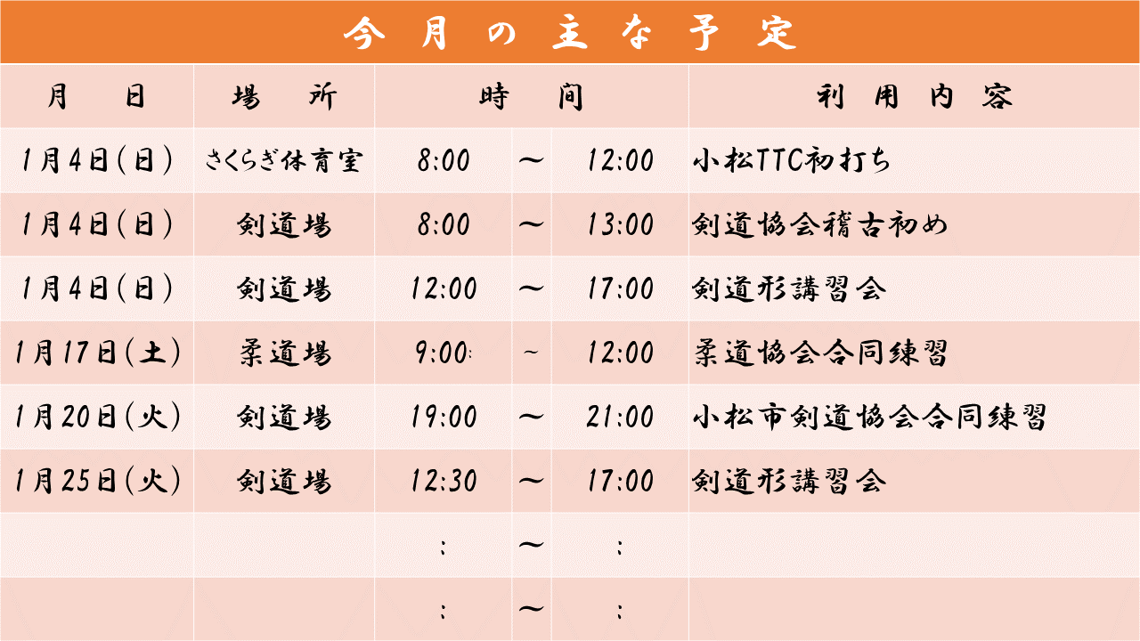 お知らせ HOMEお知らせ一覧小松市武道館 1月の行事予定(変更2) 2026.01.25スポーツnew【小松市武道館】小松市武道館 1月の行事予定(変更2) 小松市武道館1月の行事予定(変更2) 一覧 次へ
