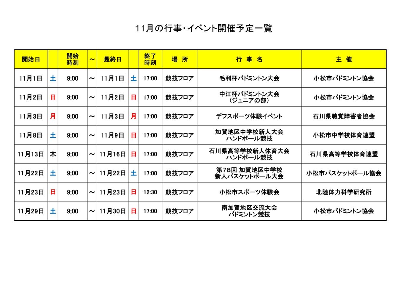 小松総合体育館 施設TOP お知らせ 施設について ご利用案内 申請・料金表等 交通アクセス 目的別施設一覧 施設予約 HOMEスポーツ施設小松総合体育館お知らせ11月の主な行事予定 小松総合体育館からのお知らせ 2025.10.26スポーツ11月の主な行事予定 11月の主な行事予定です。 一覧
