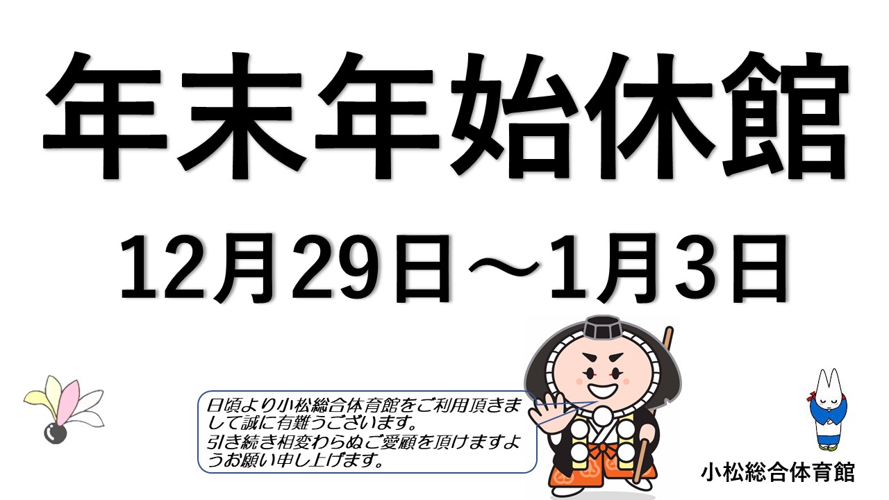 小松総合体育館 施設TOP お知らせ 施設について ご利用案内 申請・料金表等 交通アクセス 目的別施設一覧 施設予約 HOMEスポーツ施設小松総合体育館お知らせ 年末年始休館のお知らせ 小松総合体育館からのお知らせ 2025.12.03スポーツnew 年末年始休館のお知らせ 日頃より、ご利用いただきましてありがとうございます。 来年もよろしくお願いいたします。 一覧 次へ